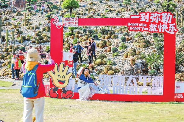 游客在弥勒太平湖山地石漠化公园打卡拍照。记者 高吴双 黄兴能 摄