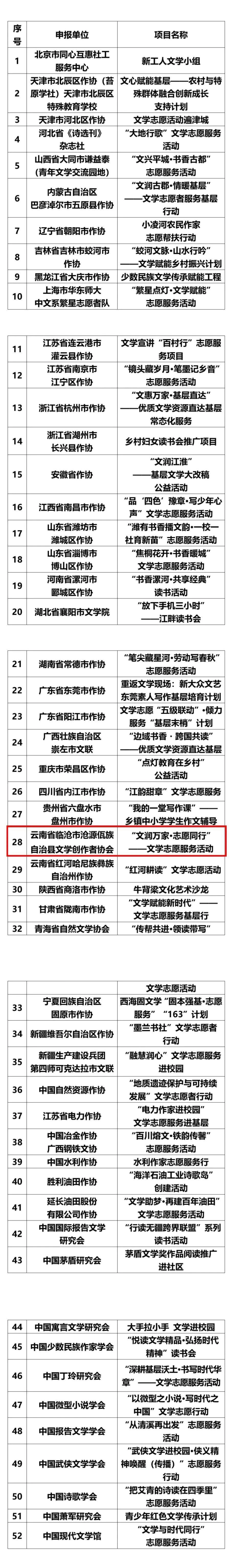 3月5日,中国作家协会公布2026年度文学志愿服务示范性重点扶持项目名单,全国共有52个项目入选,云南省临沧市沧源佤族自治县文学创作者协会申报的“文润万家·志愿同行”——文学志愿服务活动成功入选。