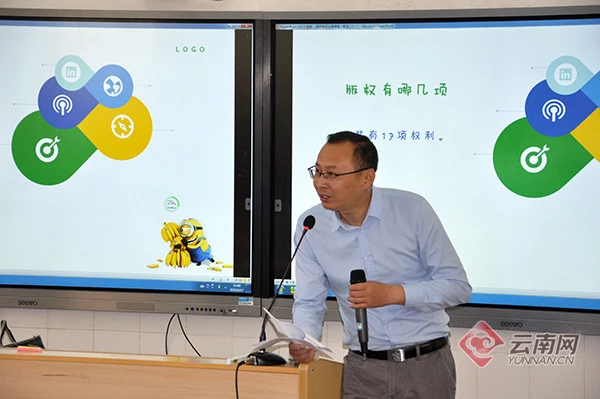 当天,来自中共云南省委宣传部版权处王成老师以《保护版权 从我做起》为题目开讲。什么是版权?版权有哪几项权利?常见的侵权盗版行为都有哪些……短短一堂课,王老师用简洁生动的语言普及版权的相关知识,让同学们意识到保护版权的重要性,并呼吁学校师生从自身做起,树立知识产权保护意识,参与到版权保护的行动中,拒绝盗版,远离和抵制有害出版物及信息。
