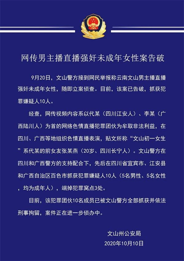 10人落网,真相大白。得力于云南当地公安机关的雷霆手段、快速侦查,查清了引起网民极大愤慨的“直播诱奸幼女”视频,竟是网络色情直播犯罪团伙为牟取非法利益打出的噱头。