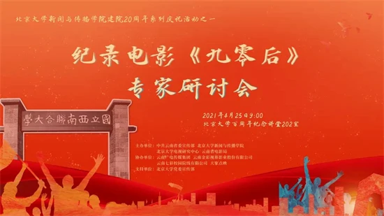 2021年4月25日,西南联大纪录电影《九零后》专家研讨会在北京大学百周年纪念讲堂202室举行。中共云南省委宣传部常务副部长、省电影局局长罗杰,云南广电传媒集团公司党委书记、董事长杨于明,纪录电影《九零后》导演徐蓓,大象点映创始人吴飞跃等电影主创方、出品方、发行方代表以及来自北京大学电视研究中心与北京大学校方、院方的专家和嘉宾出席研讨会。此次研讨会旨在从影片的题材背景、创作手法与价值意义等多个视角出发探讨作为纪录电影典范的《九零后》的价值与历史意义,挖掘主旋律影片在教育和领导广大青年层面的凝聚意义。会议由北京大学新闻与传播学院教授、北京大学电视研究中心主任俞虹主持。