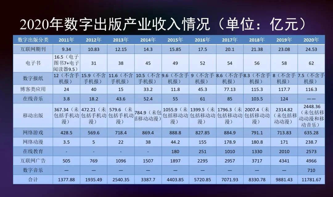2011—2020年数字出版产业收入情况(单位:亿元,表格来自《2020-2021年中国数字出版产业年度报告》)