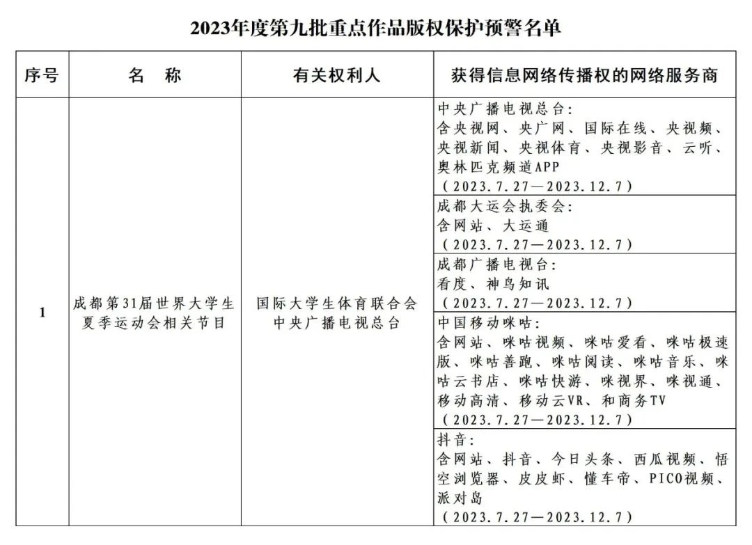 按照国家版权局《关于进一步加强互联网传播作品版权监管工作的意见》及版权重点监管工作计划,根据相关权利人上报的作品授权情况,现公布2023年度第九批重点作品版权保护预警名单。