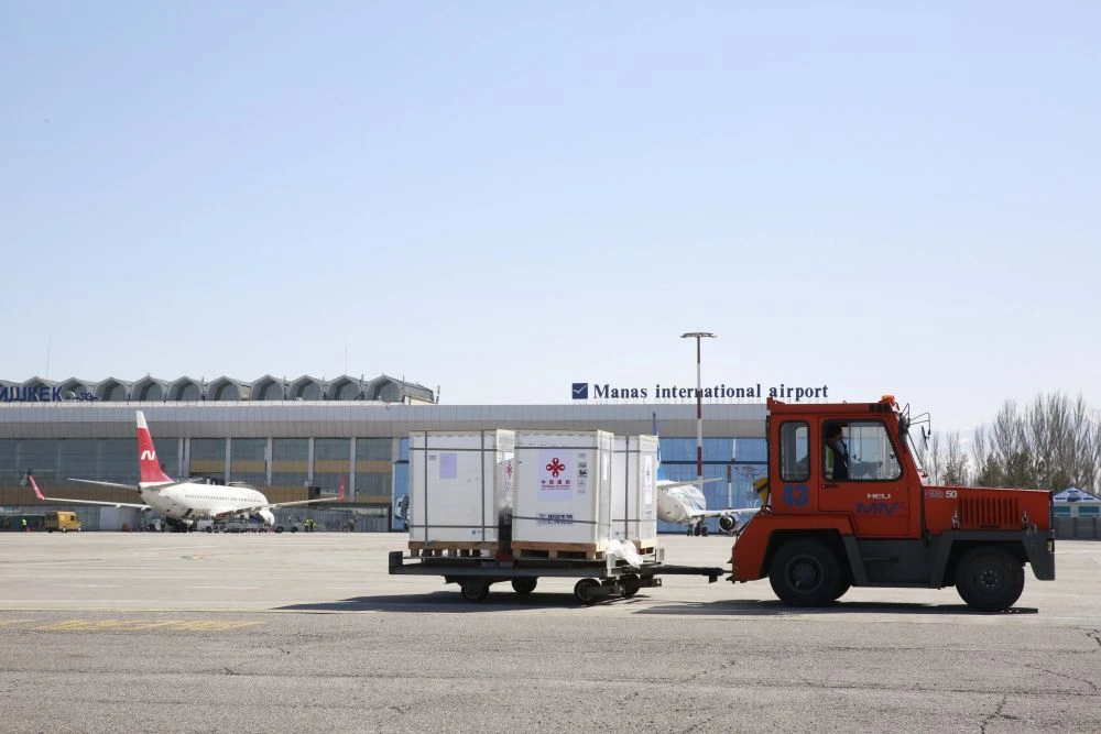 在吉尔吉斯斯坦比什凯克玛纳斯国际机场,工人转运新冠疫苗(2021年3月19日摄)。新华社发(罗曼摄)