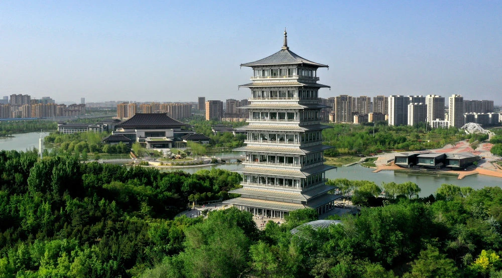 位于西安浐灞生态区的长安塔(2023年4月16日摄,无人机照片)。新华社记者刘潇摄