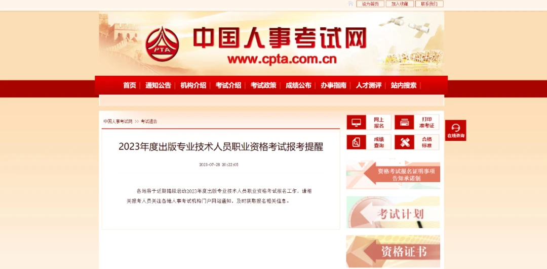 中国人事考试网近日发布《2023年度出版专业技术人员职业资格考试报考提醒》,提醒相关报考人员,各地将于近期陆续启动2023年度出版专业技术人员职业资格考试报名工作,请关注各地人事考试机构门户网站通知,及时获取报名相关信息。