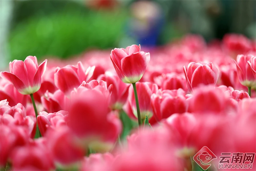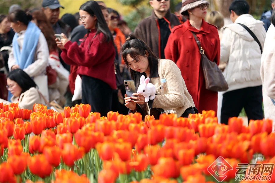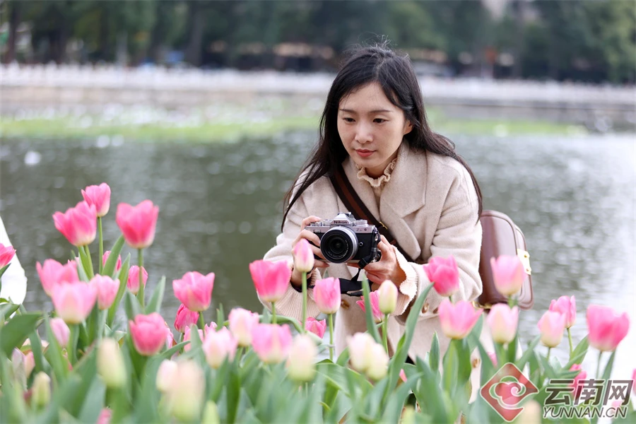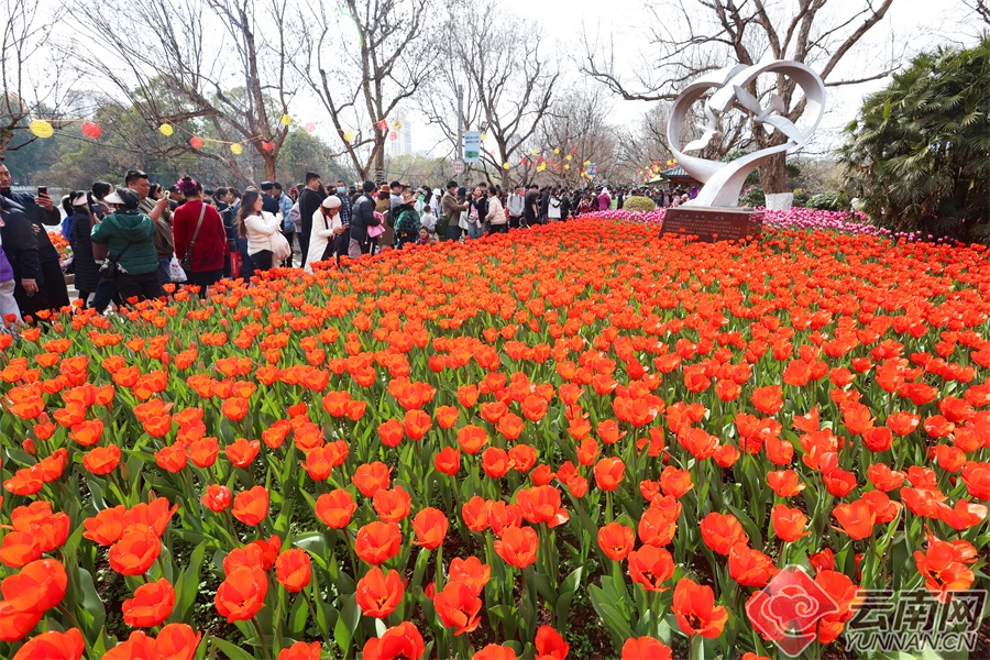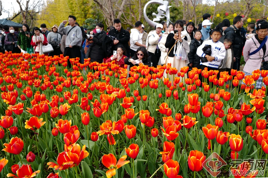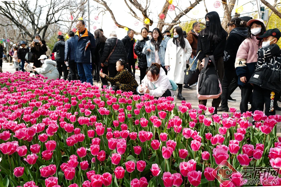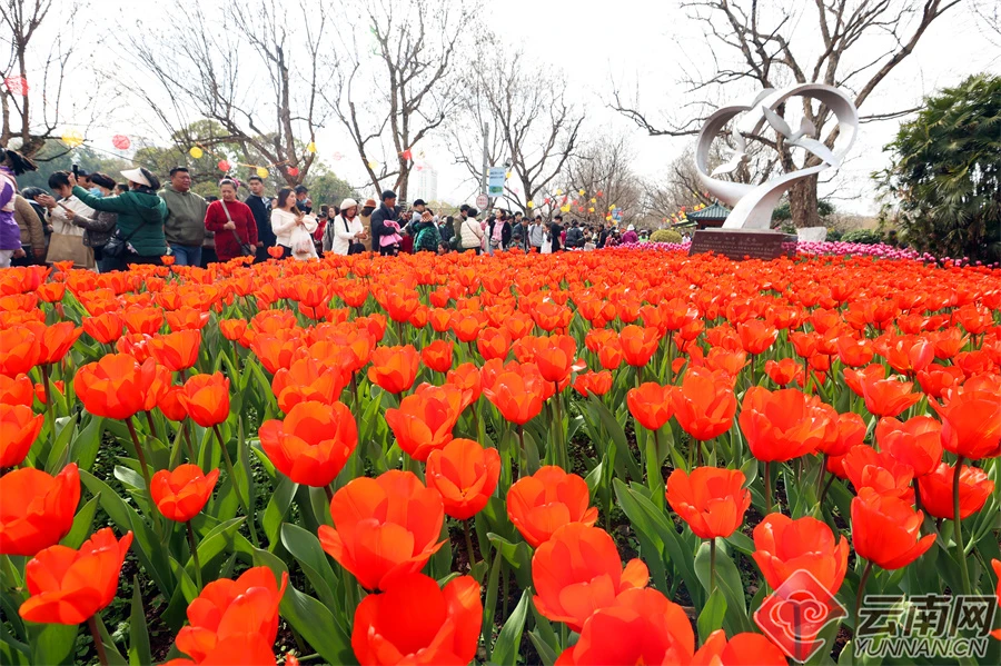 2月12日,昆明市翠湖公园郁金香争相盛放,五彩缤纷的花朵随风摇摆迎接着来自全国各地游客的到来。
