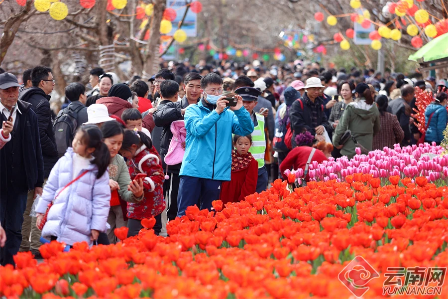 2月12日,昆明市翠湖公园郁金香争相盛放,五彩缤纷的花朵随风摇摆迎接着来自全国各地的游客。热闹的集市、随风摇摆的红灯笼、飞舞的红嘴鸥和欢欢喜喜过大年的人们,交织出一幅喜庆热闹的新春盛景。