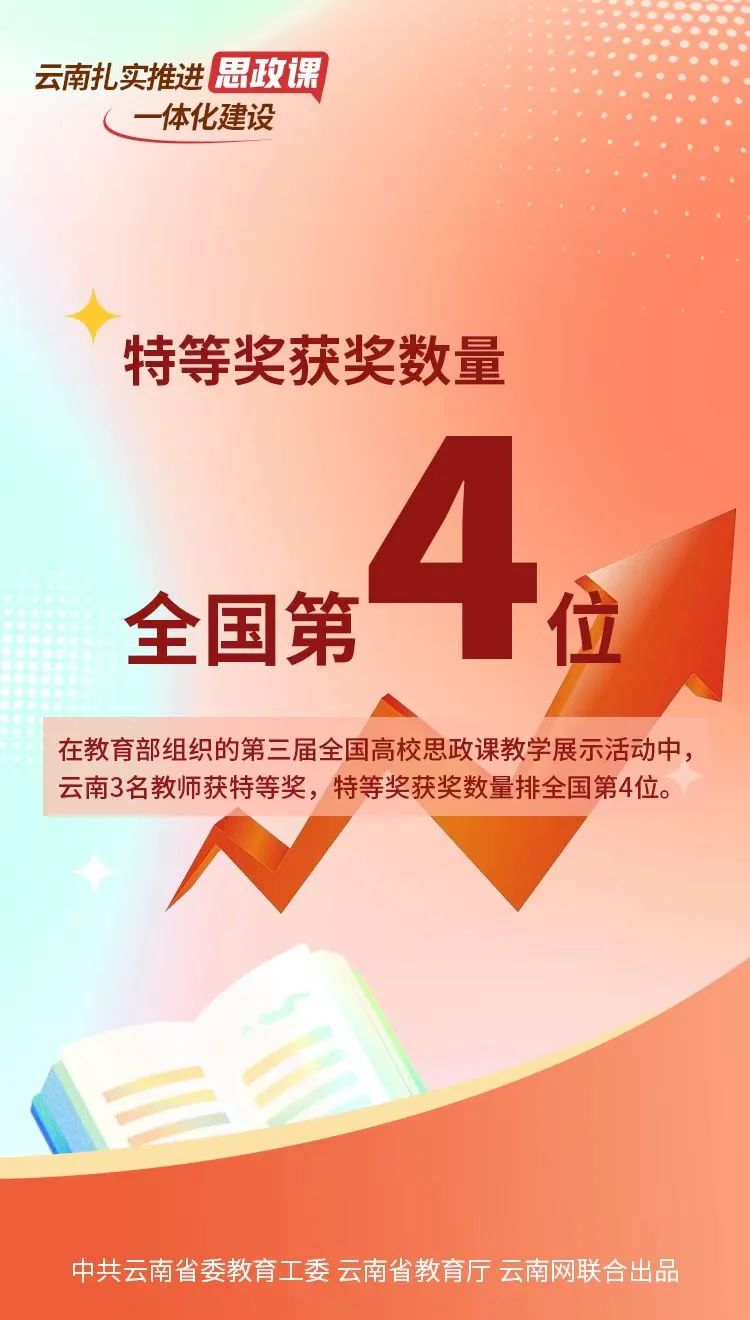 在教育部组织的第三届全国高校思政课教学展示活动中,云南3名教师获特等奖,特等奖获奖数量排全国第4位。
