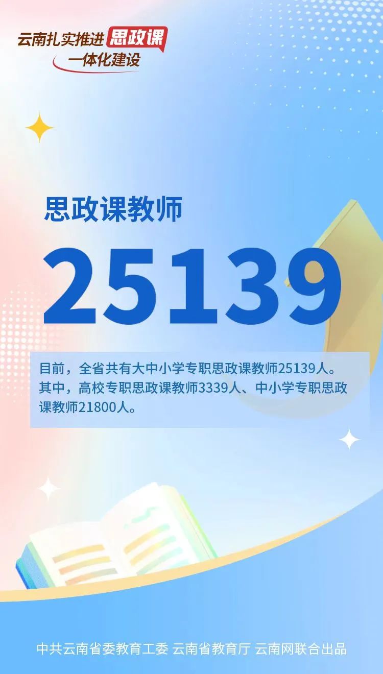 目前,全省共有大中小学专职思政课教师25139人。其中,高校专职思政课教师3339人、中小学专职思政课教师21800人。此外,云南省培育创建一批思政课名师工作室,2名教师入选全国高校思政课教学指导委员会委员,2名教师入选全国高校思政课名师工作室项目,2名教师获评全国高校优秀思政课教师奖教金。