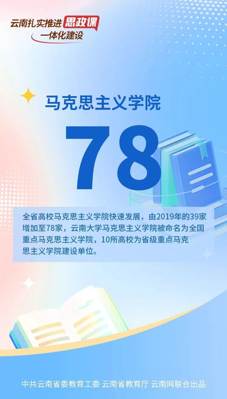 全省高校马克思主义学院快速发展,由2019年的39家增加至78家,云南大学马克思主义学院被命名为全国重点马克思主义学院,10所高校为省级重点马克思主义学院建设单位。