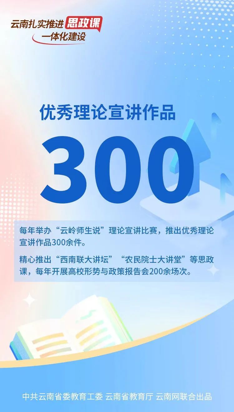 组织开展“学习新思想、做好接班人”“从小学党史、永远跟党走”等主题实践活动,每年举办“云岭师生说”理论宣讲比赛,推出优秀理论宣讲作品300余件;精心推出“西南联大讲坛”“农民院士大讲堂”等思政课,每年开展高校形势与政策报告会200余场次。