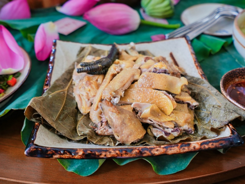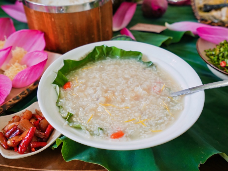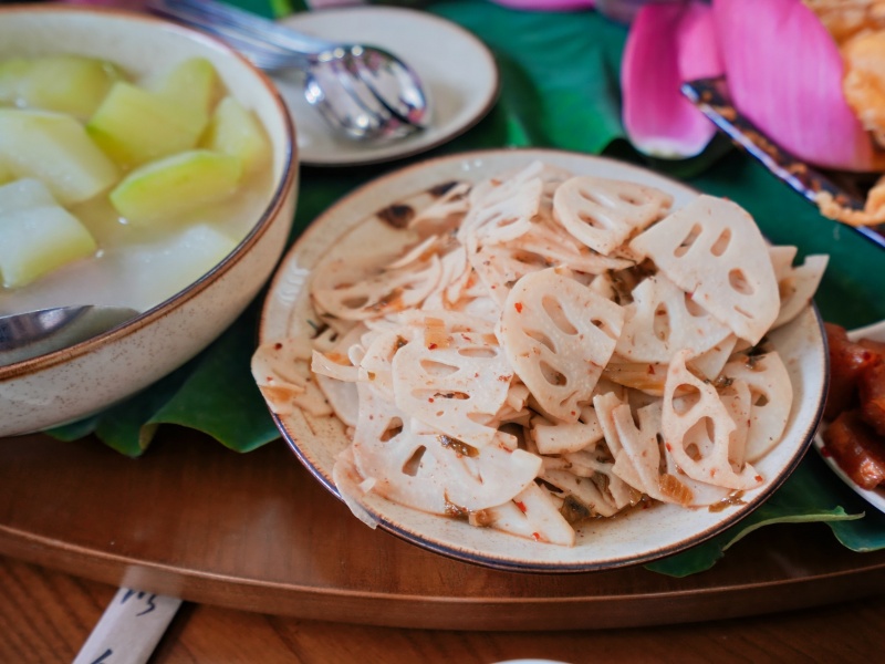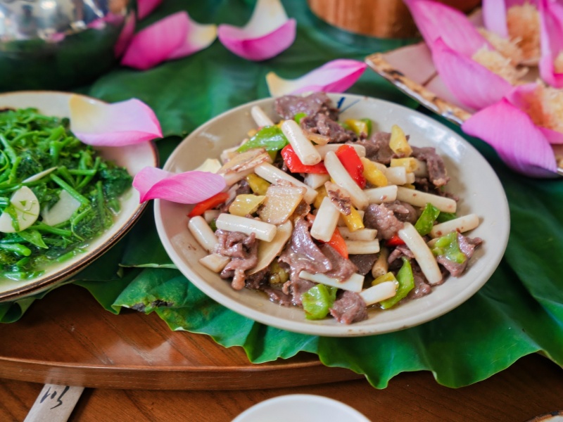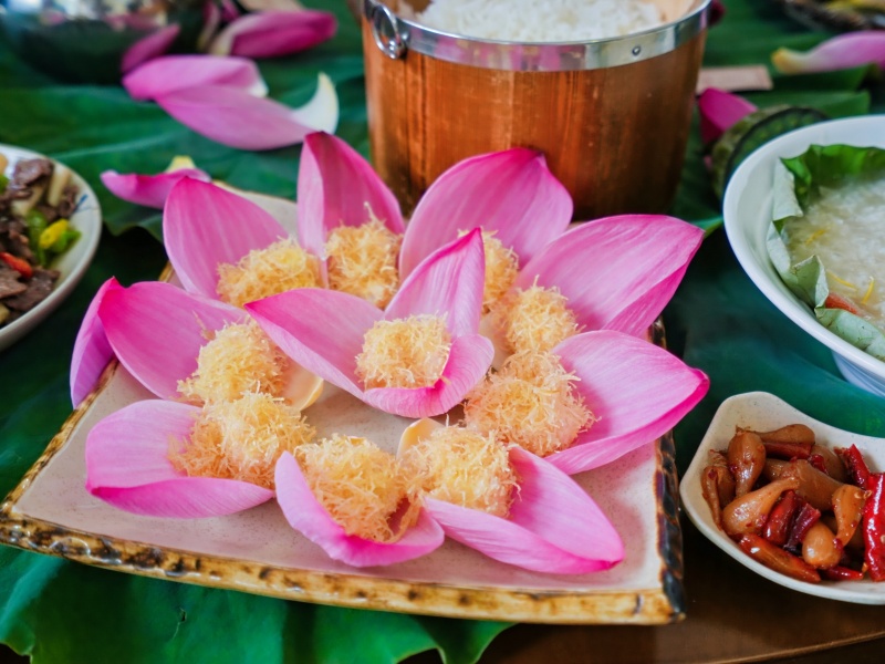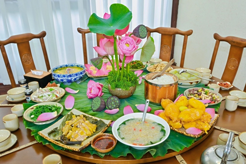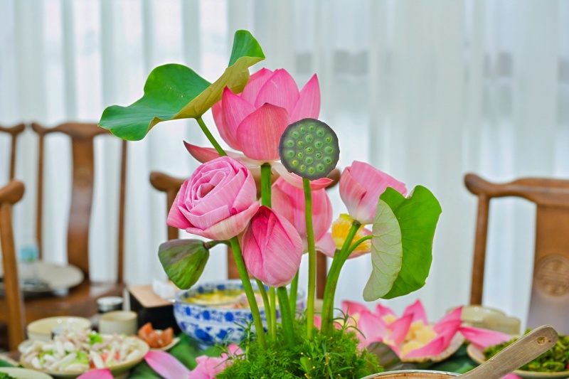 荷叶包裹鸡肉,做成清香扑鼻的荷叶鸡;莲藕剁碎,与大米等煮成藕粥;金丝虾球放入新鲜荷花里,摆盘精致;藕片中加入酸菜同炒,酸甜可口;清炒藕带,保持了食材的原汁原味……