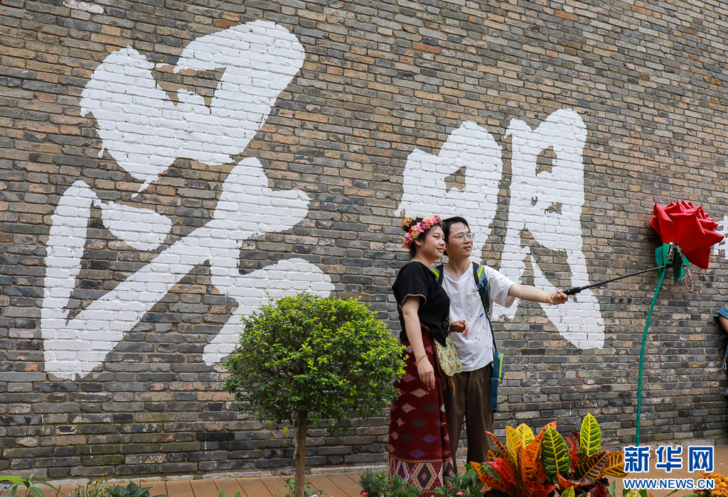 游客在昆明老街网红打卡墙拍照(10月4日摄)。新华网发(郑益 摄)