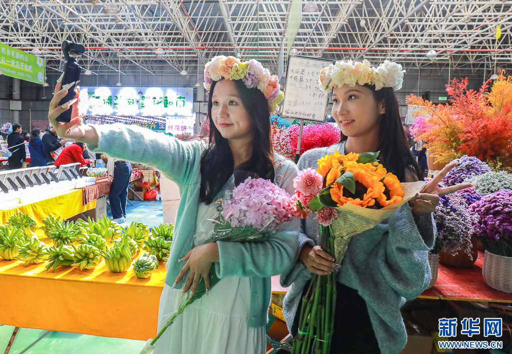 游客在昆明斗南花卉市场拍照打卡(10月1日摄)。新华网发(郑益 摄)