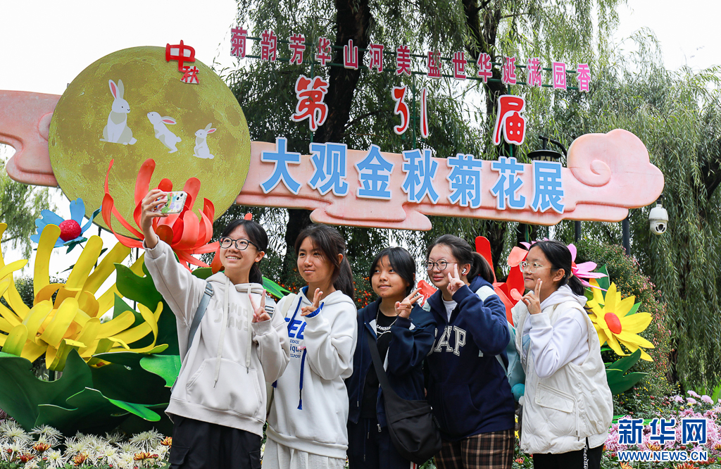 前来大观公园观赏菊花的游客(10月1日摄)。新华网发(郑益 摄)