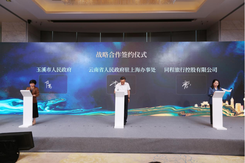 玉溪市人民政府副市长陈静、云南省人民政府驻上海办事处副主任李继显、同程旅行政府合作部CEO曹帅作为签约代表共同上台签署,三方将共建“玉溪旅居人才港”,目标三年引流高端游客100万人次。