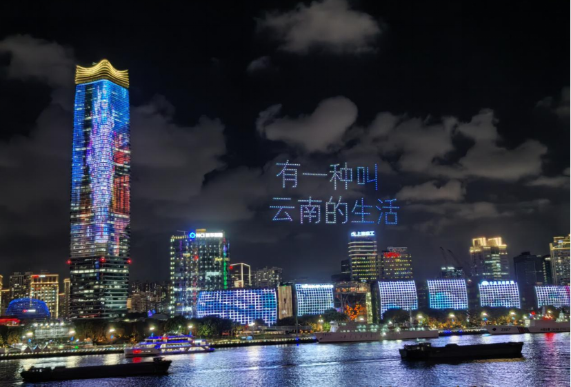 夜幕降临,花灯初上,500架无人机在黄浦江畔的夜空中列阵升腾,呈现出“有一种叫云南的生活”字样,以璀璨光影艺术生动诠释了旅居云南的独特魅力。