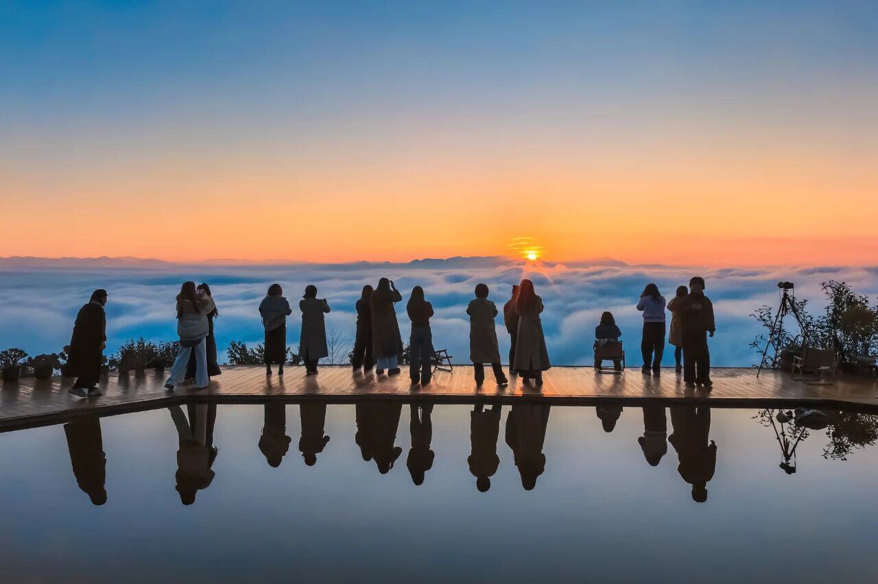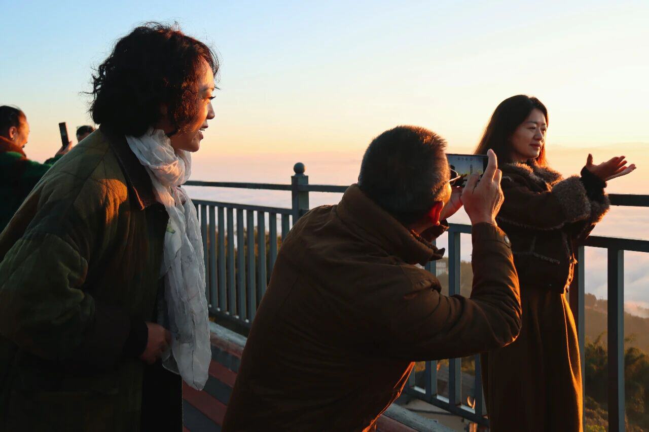 观景台上,游客们沉浸在震撼的景色中,纷纷举起相机、手机记录这难忘的一刻。不少人迎着云海摆出创意造型合影,也有人面对浩瀚云海舒展身体,即兴打上一段拳法,在自然画卷中融入动静皆宜的人文趣味。