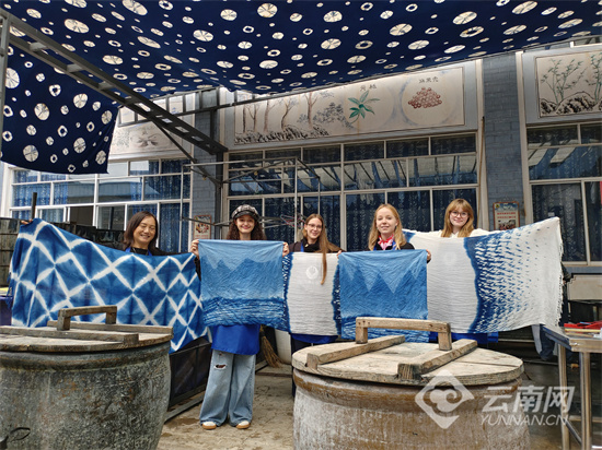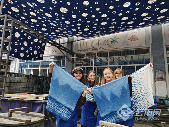 在巍山县三彝扎染工贸有限公司的扎染工坊里,靛蓝的染缸散发出独特的气味。在扎染师傅的指导下,学生们专注地将围巾折叠、用棉线缠绕捆扎,再小心翼翼地将布团反复浸入染缸。“展开的那一刻最神奇,即使制作流程相似,每一件作品都是独一无二的。”朱莉展示着她的扎染围巾,“云南的文化多样性令我印象深刻。我特别喜欢扎染,我亲手体验的,正是匠人们日复一日坚守的事业,这让我感觉特别有意义。”