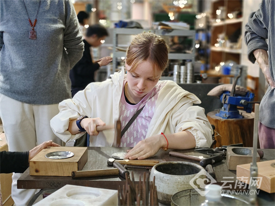 在昆明拾翠国际民艺园区,她们还体验了宋代点茶与锡器制作。穿上汉服,手腕轻悬,慢慢熟悉点茶的手法;在锡盘上,她们认真刻下自己的名字与日期,亲手为这次研学打造专属的纪念。