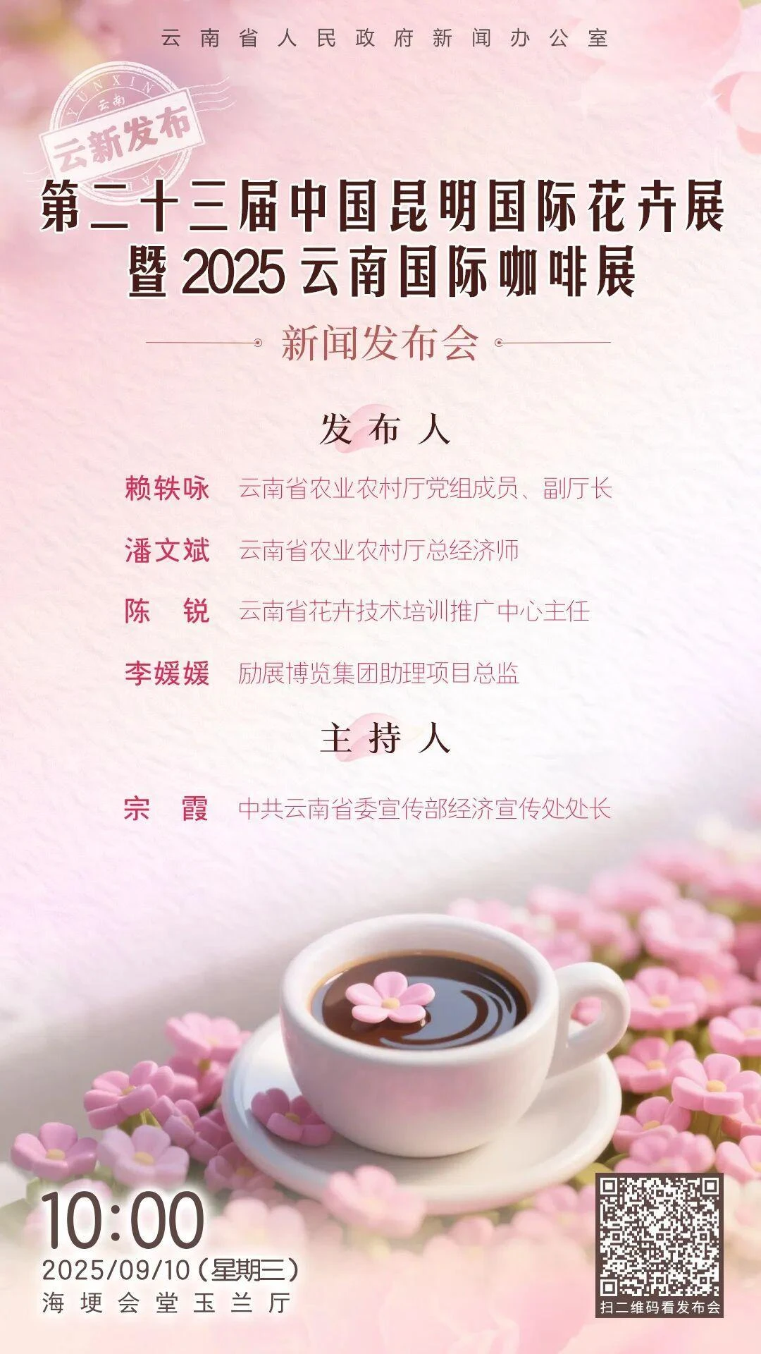 9月10日上午,云南省人民政府新闻办公室在云南海埂会堂举行第二十三届中国昆明国际花卉展暨2025云南国际咖啡展新闻发布会,介绍相关情况并回答记者提问。