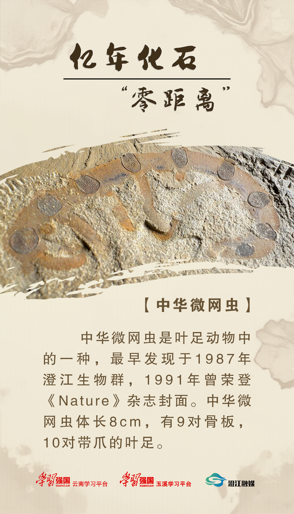 中华微网虫只发现于澄江动物群。其身体呈长形,头短而小,尾长,躯干具有9对网形骨片和10对带爪叶足。因为缺少软体组织,针对它们的网状骨片有许多离奇解释:一是包壳类群体生物;二是储卵仓;三是甚至被认为是最早的放射虫。在澄江发现的完整微网虫化石令人惊讶,因为谁也未曾想到这些奇形怪状的骨板竟然长在毛状动物的身上。这也破解了中华微网虫的眼睛之谜,为蜕皮动物早期演化提供了关键证据。因此,中华微网虫荣登英国《自然》杂志第6232期封面,成为“化石明星”。(统筹:唐莉娜 和晓,策划:李晓燕 矣萍,制作:代文娟 杨朔 张婷,海报设计:朱军,编审:白芯源)