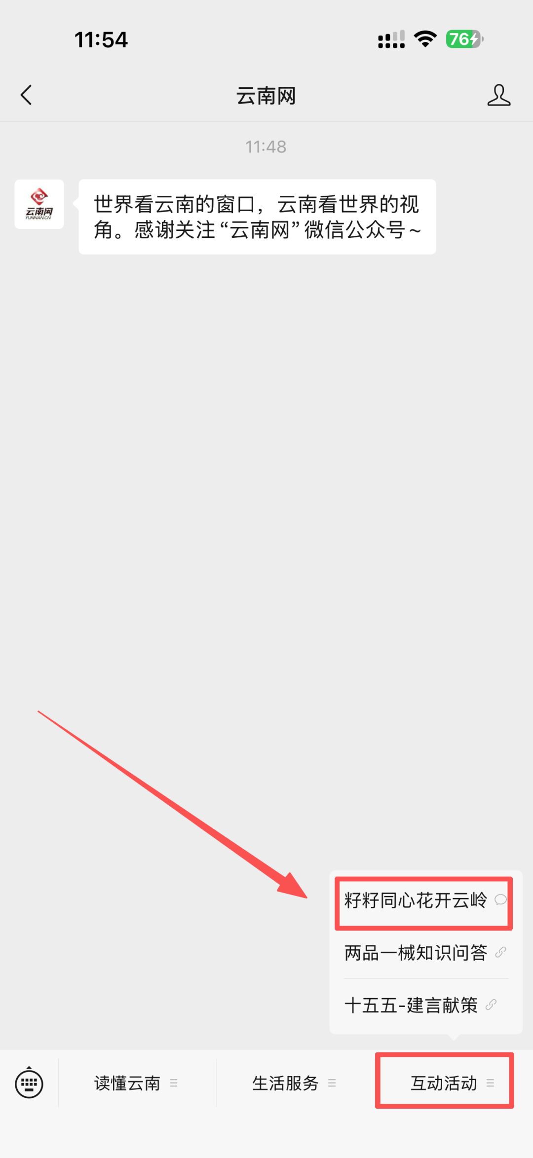 1.关注“云南网”微信公众号,进入消息页面。