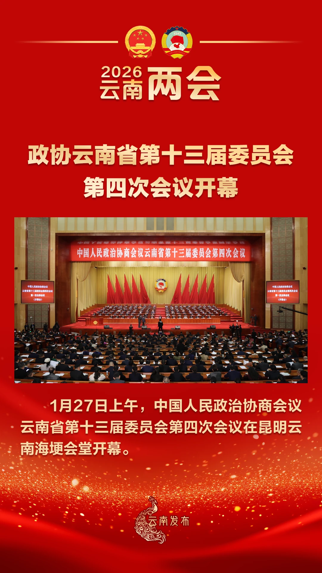 1月27日上午,中国人民政治协商会议云南省第十三届委员会第四次会议在昆明云南海埂会堂开幕。