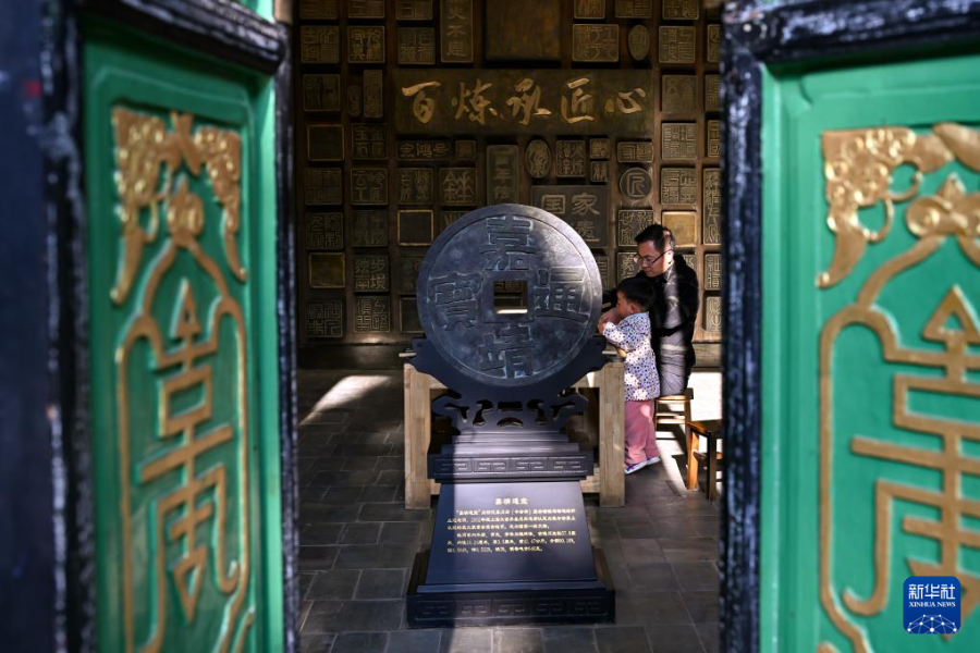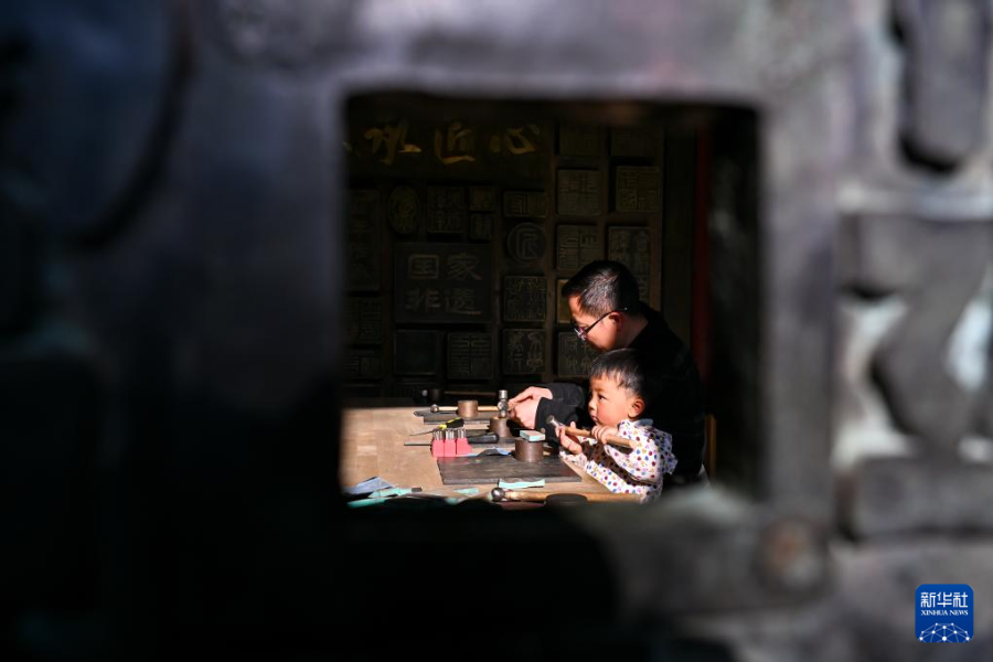 3月25日,在会泽县国家级非遗斑铜制作技艺传习馆,张氏斑铜第十三代传人张伟在教儿子敲打铜器。传习馆开设在会泽古城江西会馆内,江西会馆又称万寿宫,始建于清康熙年间。新华社记者 张铖 摄