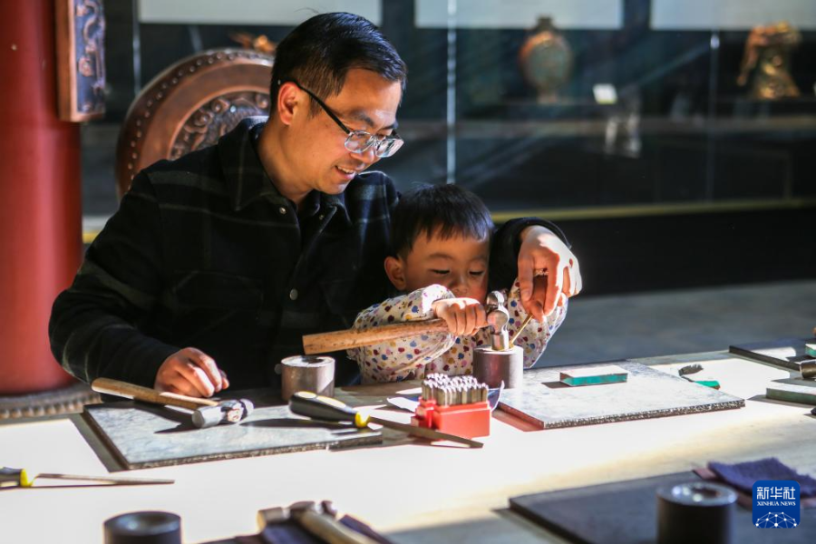 3月25日,在会泽县国家级非遗斑铜制作技艺传习馆,张氏斑铜第十三代传人张伟在教儿子敲打铜器。传习馆开设在会泽古城江西会馆内,江西会馆又称万寿宫,始建于清康熙年间。新华社记者 林立平 摄