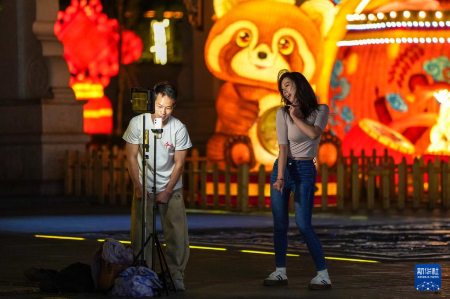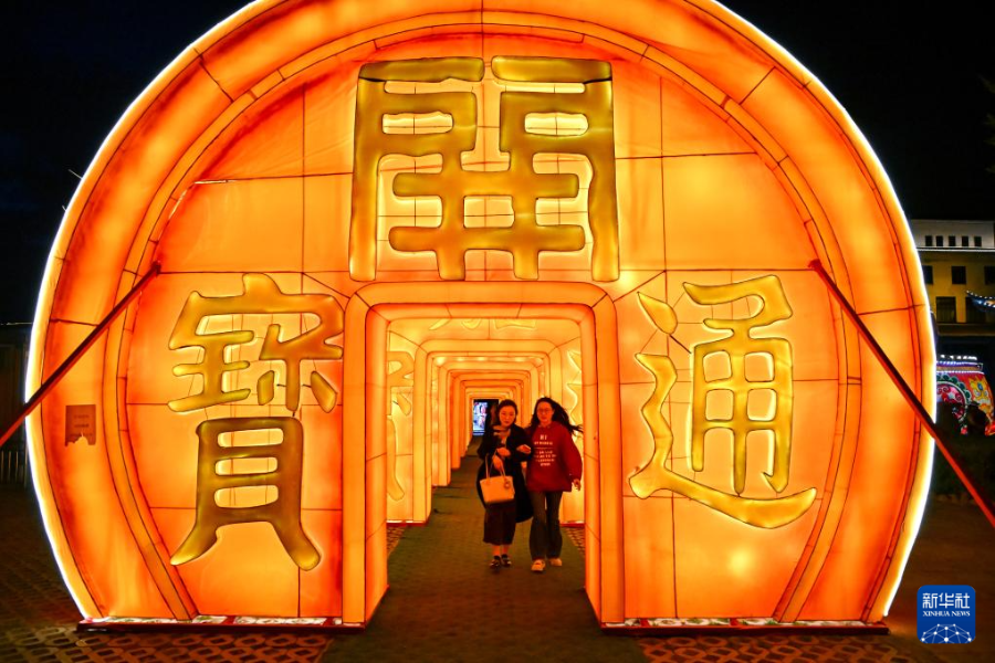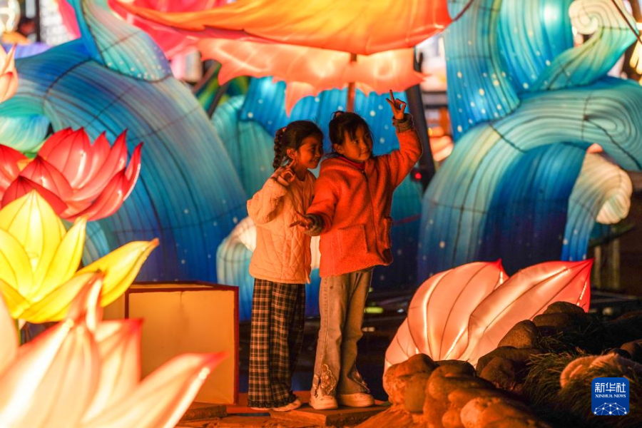 3月25日,游客在会泽古城参观灯展。新华社记者 张铖 摄