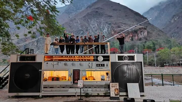 游客在绿汁镇“录音机咖啡馆”顶合影留念图源:新华社