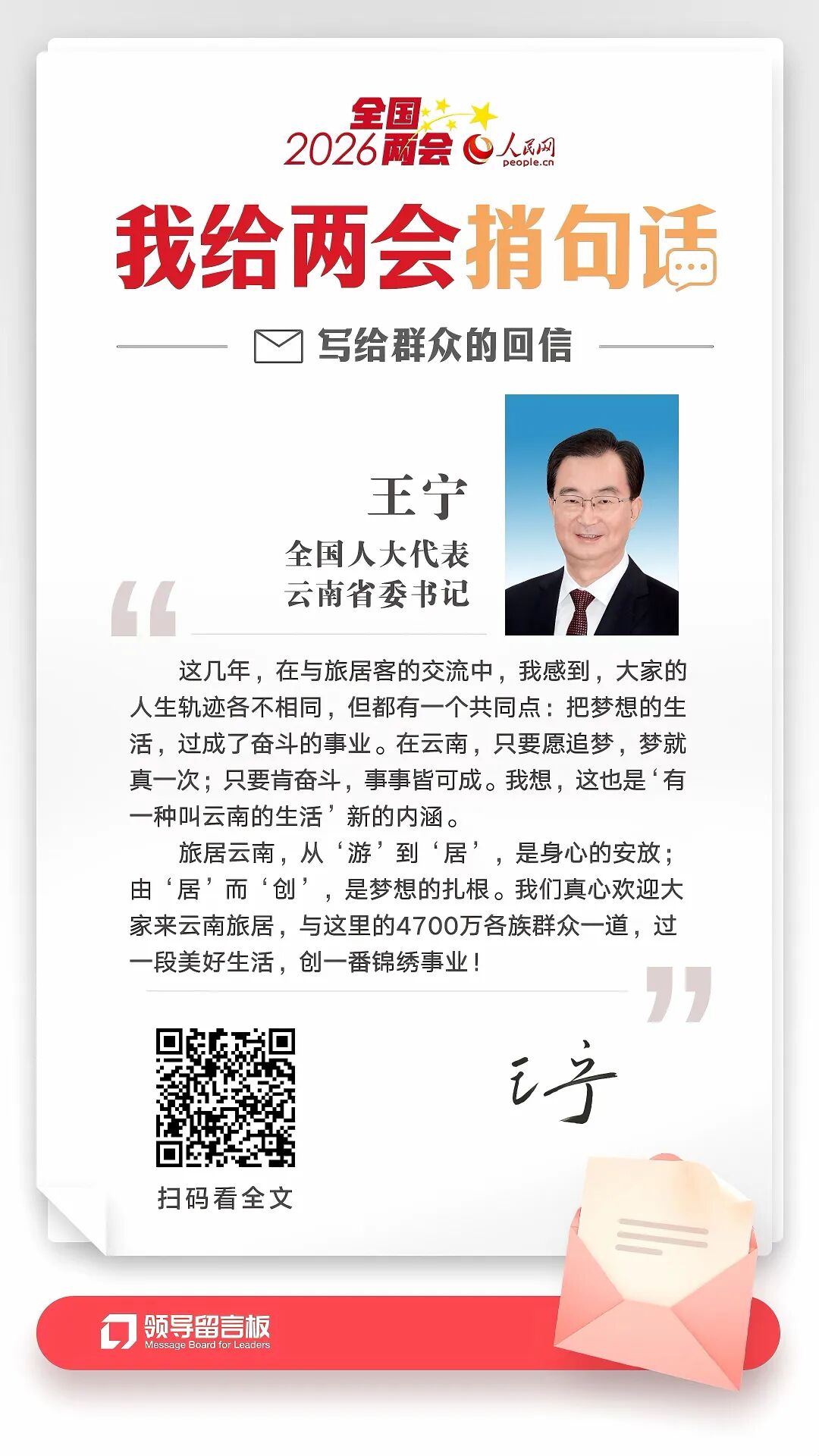 回信中,王宁说:“这几年,在与旅居客的交流中,我感到,大家的人生轨迹各不相同,但都有一个共同点:把梦想的生活,过成了奋斗的事业。在云南,只要愿追梦,梦就真一次;只要肯奋斗,事事皆可成。我想,这也是‘有一种叫云南的生活’新的内涵。”