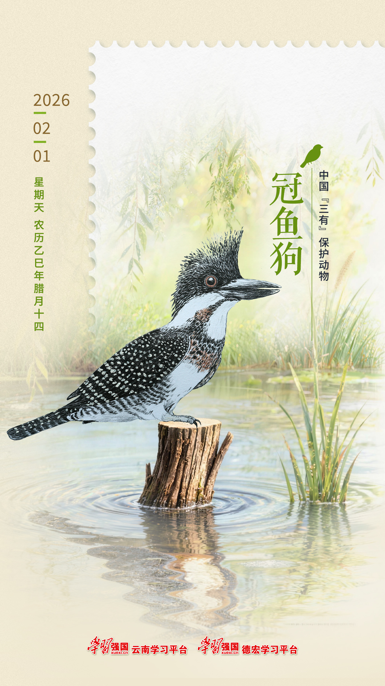 编者按:云南省不仅是中国生物多样性最为丰富的地区之一,也是全球重要的生态安全屏障。2026年全年共365天,“学习强国”云南学习平台、“学习强国”德宏学习平台联合以手绘鸟类图片为基础设计制作鸟类海报日历《羽翼时光》,力图通过这种独特的艺术形式搭建一个传播生态文明理念的平台,为公众提供一个实用的日历工具。同时,让公众领略云南省丰富的鸟类资源和优美的自然风光,并传递出保护生态环境、促进人与自然和谐共生的理念,让每一个使用这份日历的人都能成为生态文明建设的参与者和推动者。